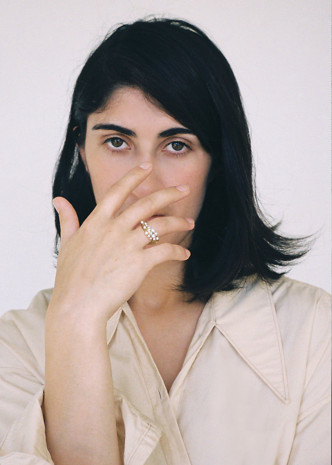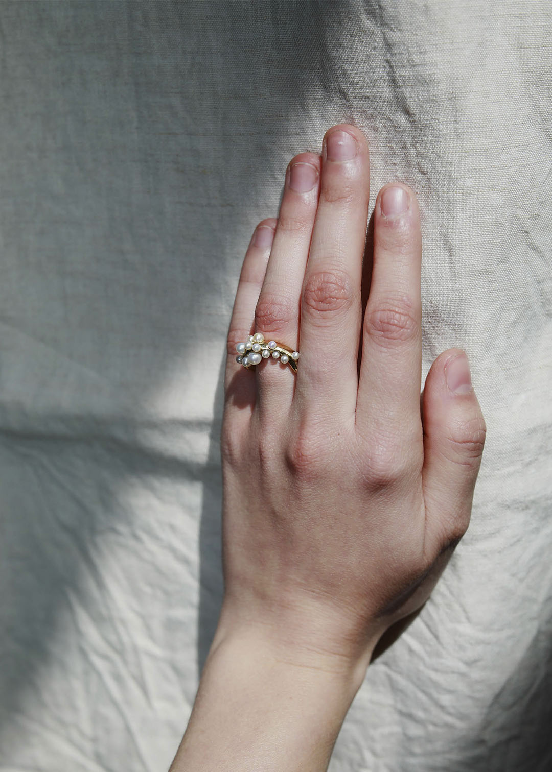 Anillo en plata chapada en oro cuajado de perlas de diferentes tamaños.