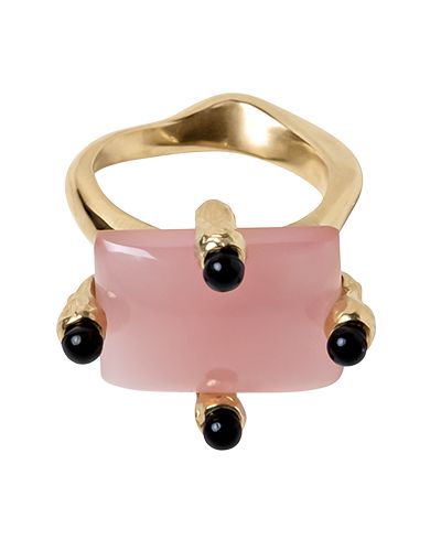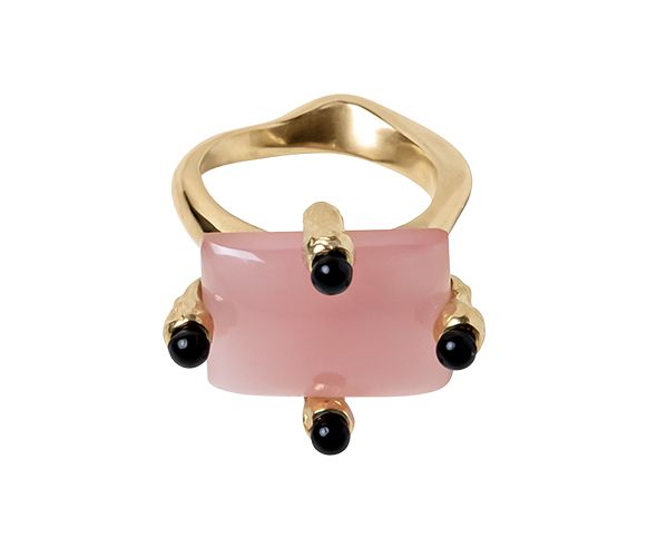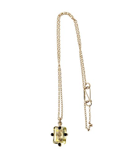 Este anillo tipo cóctel está hecho de plata bañada en oro, con un cuarzo limón de 12×16 mm engastado con garras. Las puntas de las garras están adornadas con cuatro cristales negros, creando un sutil contraste con el cuarzo limón.