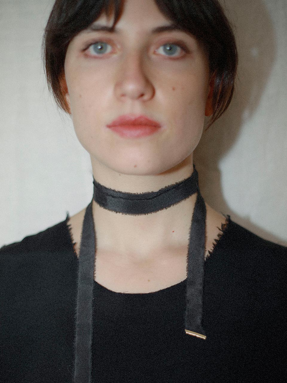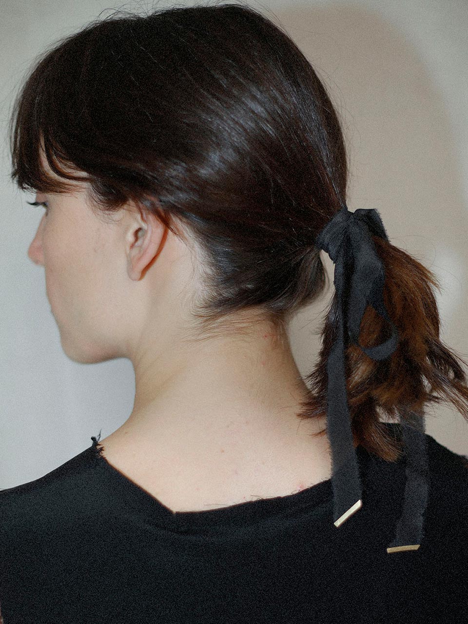 Esta pieza está hecha con una delicada cinta de seda rematada con terminales de plata bañada en oro. Un accesorio versátil que puedes llevar en el pelo, alrededor del cuello, la muñeca o la cintura, adaptándose de forma natural a cualquier ocasión.