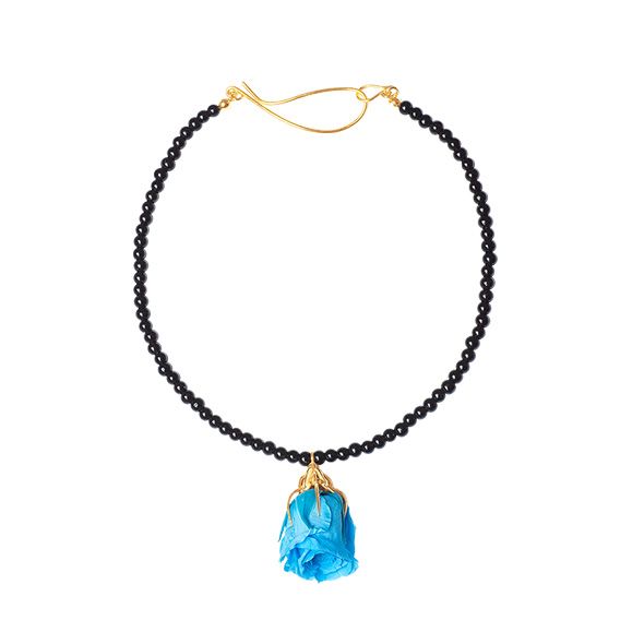 Collar de plata chapada en oro engastado con una rosa natural preservada y onix. La rosa es una rosa natural que ha sido sometida a un proceso de preservación. Mantenla alejada del agua y guárdala en su caja original cuando no la estés usando. De esta manera mantendrá sus propiedades durante muchos años.