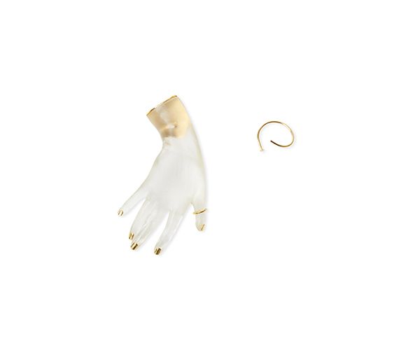 Pendiente con forma de mano renacentista realizada en resina transparente con uñas en plata chapada ne oro. Se acompaña de un aro pequeño para combinar en la otra oreja.