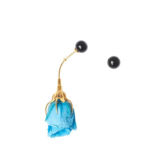 Pendiente de plata chapada en oro engastado con una rosa natural preservada. Viene acompañado de un pendiente engastado con onix para la otra oreja. La rosa es una rosa natural que ha sido sometida a un proceso de preservación. Mantenla alejada del agua y guárdala en su caja original cuando no la estés usando. De esta manera mantendrá sus propiedades durante muchos años.