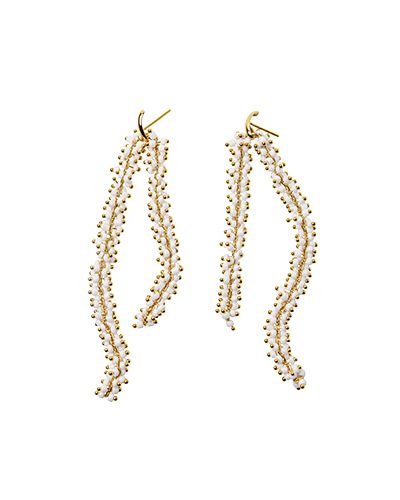 Pendientes de cadena bañada en oro con cuentas de cristal blanco repartidas a lo largo del diseño. La parte que está en contacto con la piel está realizada en plata de ley bañada en oro.Se venden por pareja. Longitud: 15cm.