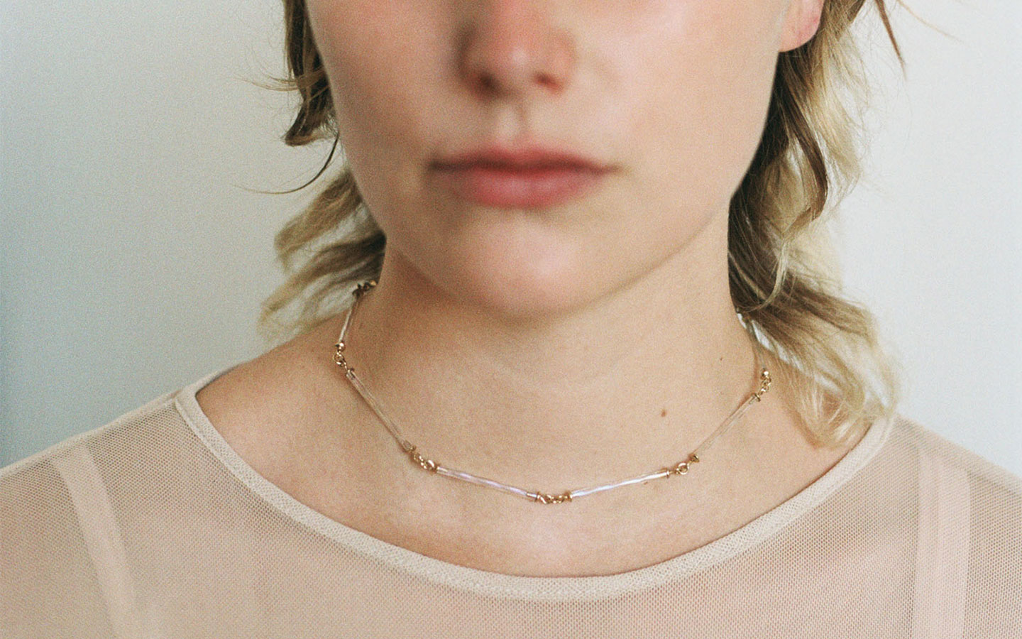 ゴールドメッキシルバー、虹色ヴィンテージガラスのショートネックレス。