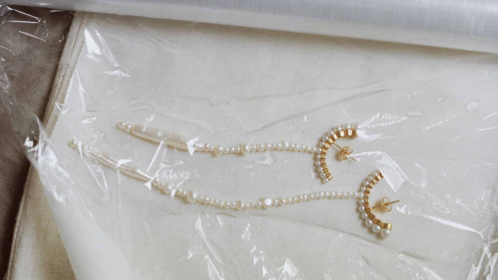淡水パールとバロック・ウォーター・パールのゴールド・コーティング・シルバー・ピアスのミスマッチ・セット。
