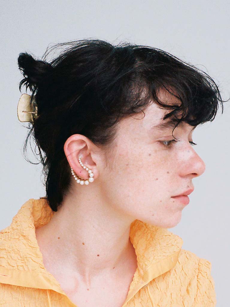 Gradient fresh water pearls and gold plated silver earring. Designed for the right ear and very easy and comfortable to wear.