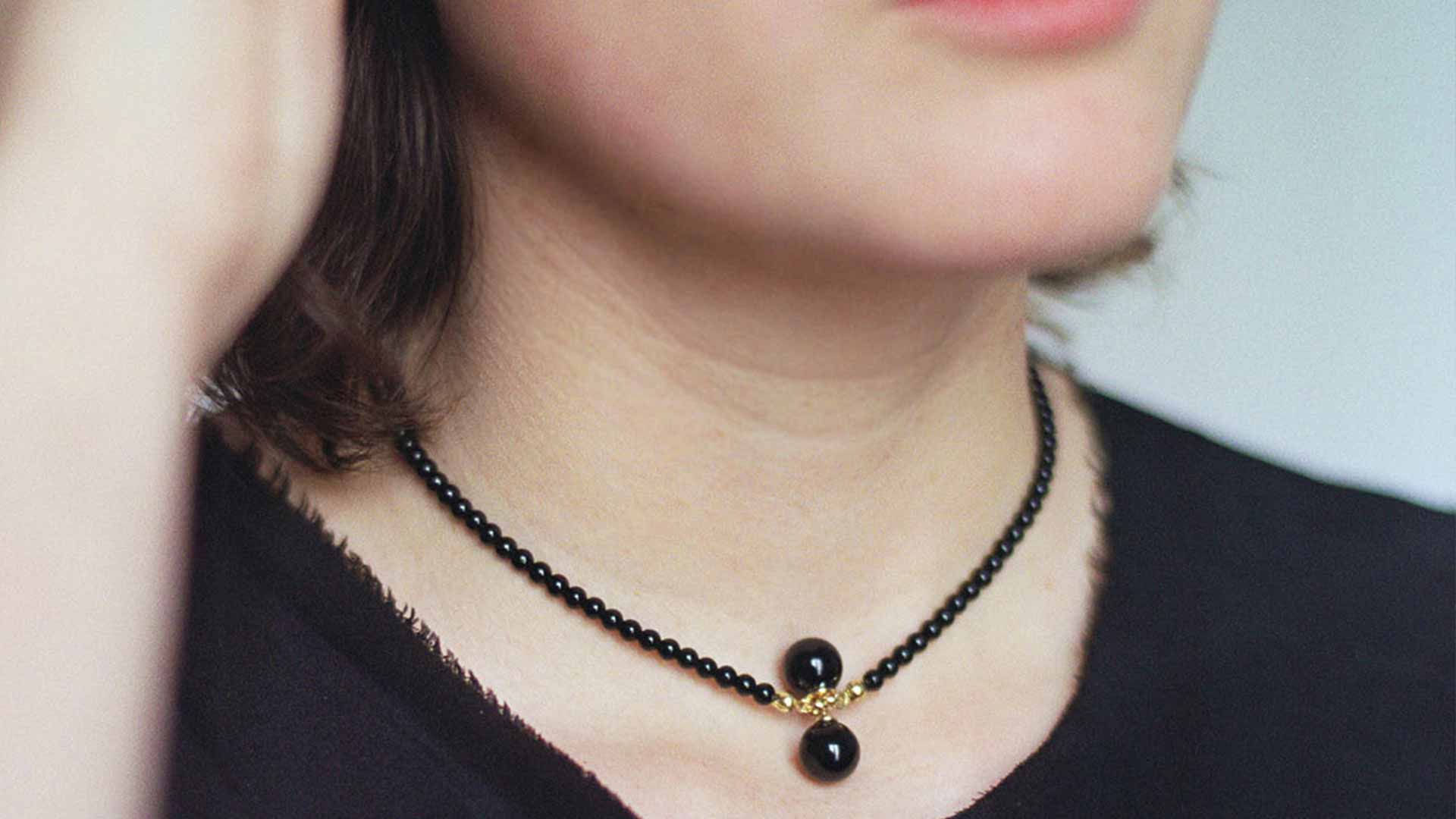Gold plated sterling silver and 5mm onyx beads short necklace with a 8mm onyx earring piece. The earring can be used separately and it can be also used as the clasp of a chain. The front and back may be mixed and matched with other piercings from the SISTER, CHROMA and SELF collection, creating infinite possible looks.