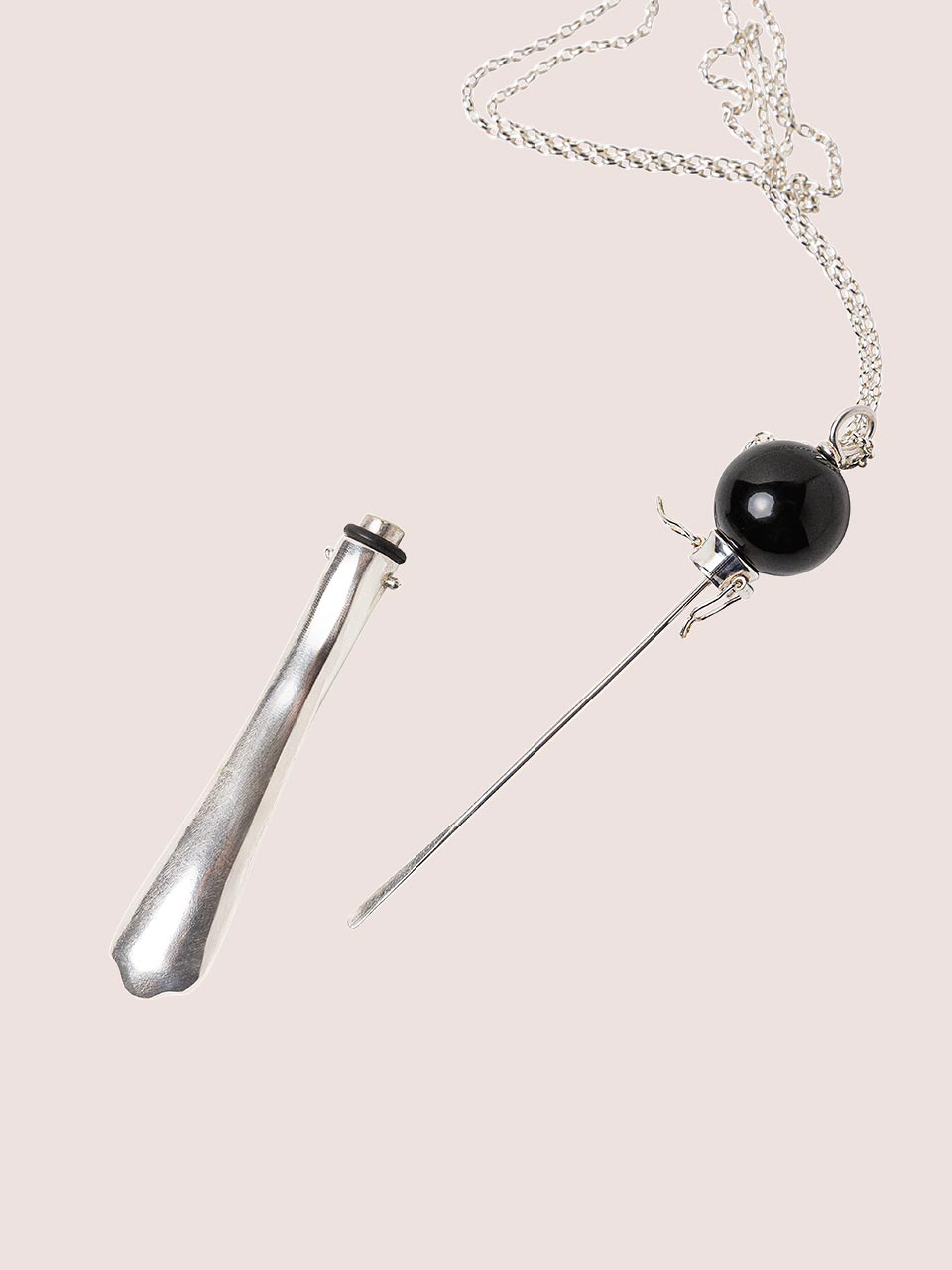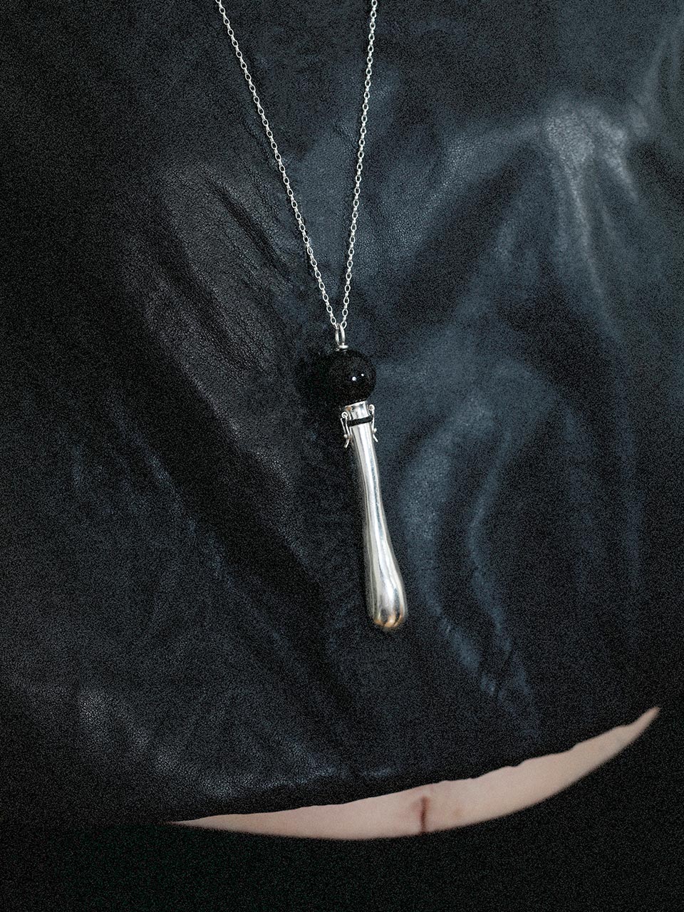 A sterling silver pendant with a sculptural form that hints at a nose. Closes with onyx and comes with a chain and a tiny funnel to fill it with perfume—or anything you choose to carry. Designed to give the wearer freedom, it transforms a small ritual into a personal, playful gesture.