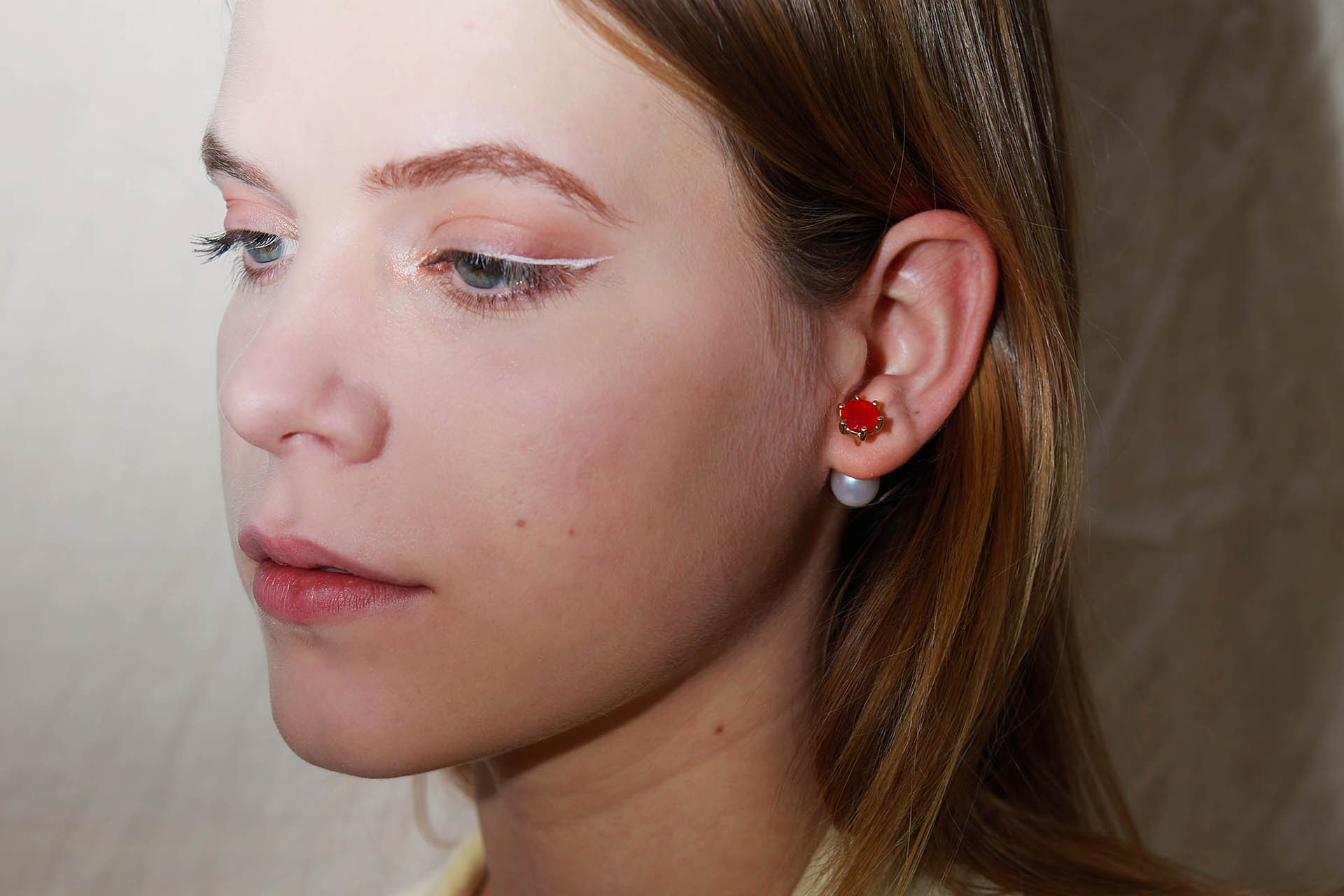 Gold plated silver two-sided earring set with a large oval fresh water pearl and a magenta chalcedony. It can be also used as the clasp of a chain. The front and back may be mixed and matched with other piercings from the SELF collection, creating infinite possible looks.