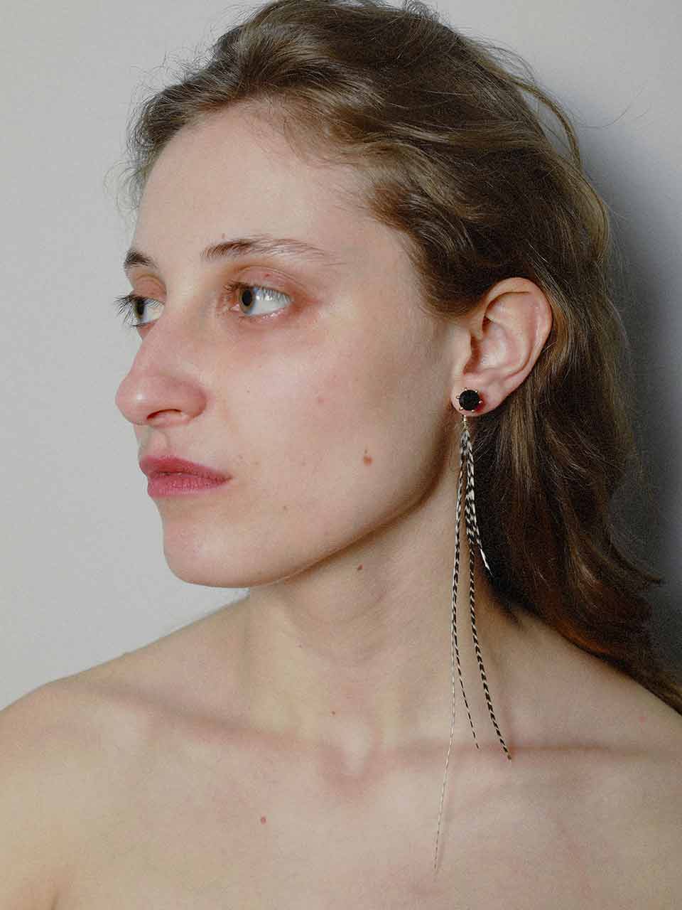 Mismatched pair of gold plated silver earrings set with a 8 mm onyx and grizzly rooster feathers. The front and back may be mixed and matched with other piercings creating infinite possible looks.