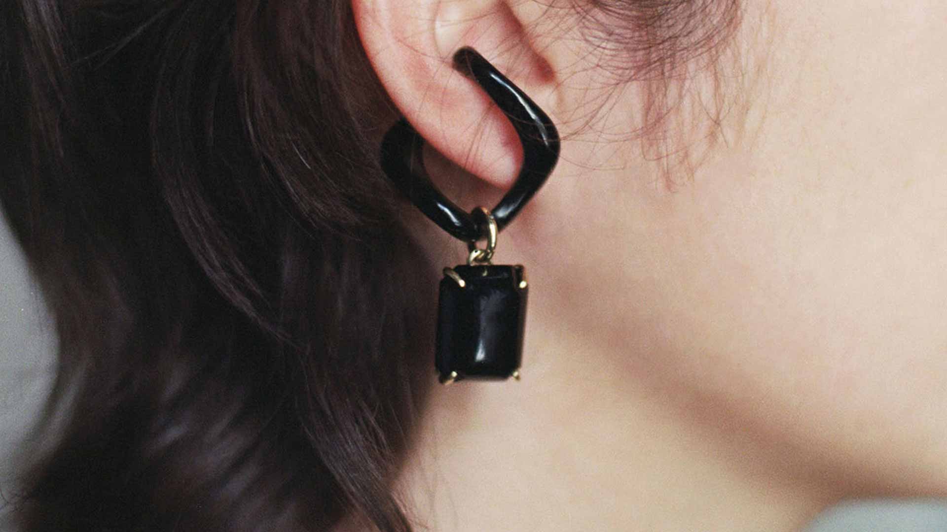 Hand carved onyx ear cuff with an onyx pendant in gold plated silver. This piece is an sculpture itself as all the onyx parts have been hand carved by an artisan. Designed for the right ear.