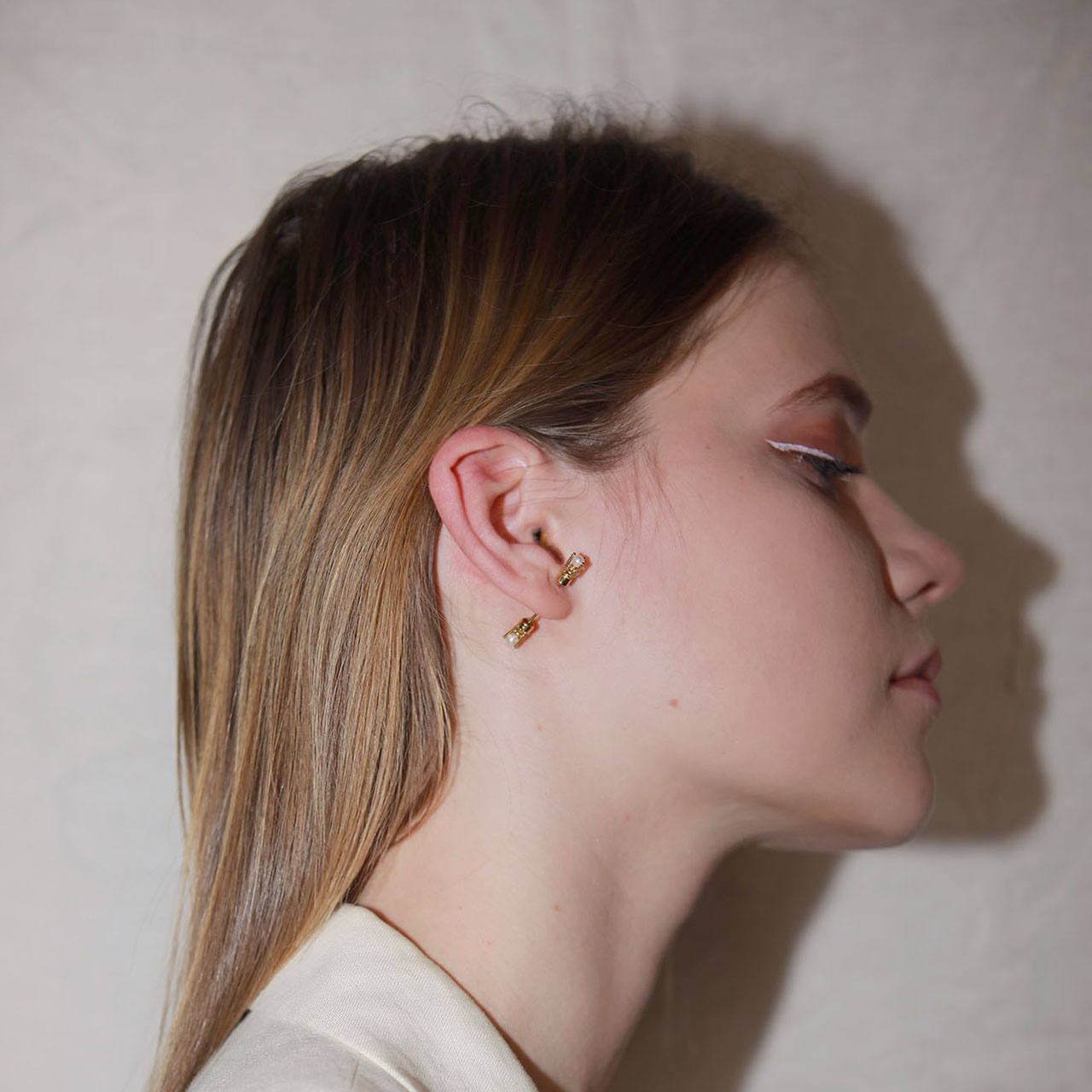 Gold plated two-sided earring set with fresh water pearls. It can be also used as the clasp of a chain. The front and back may be mixed and matched with other piercings from the SELF collection, creating infinite possible looks.