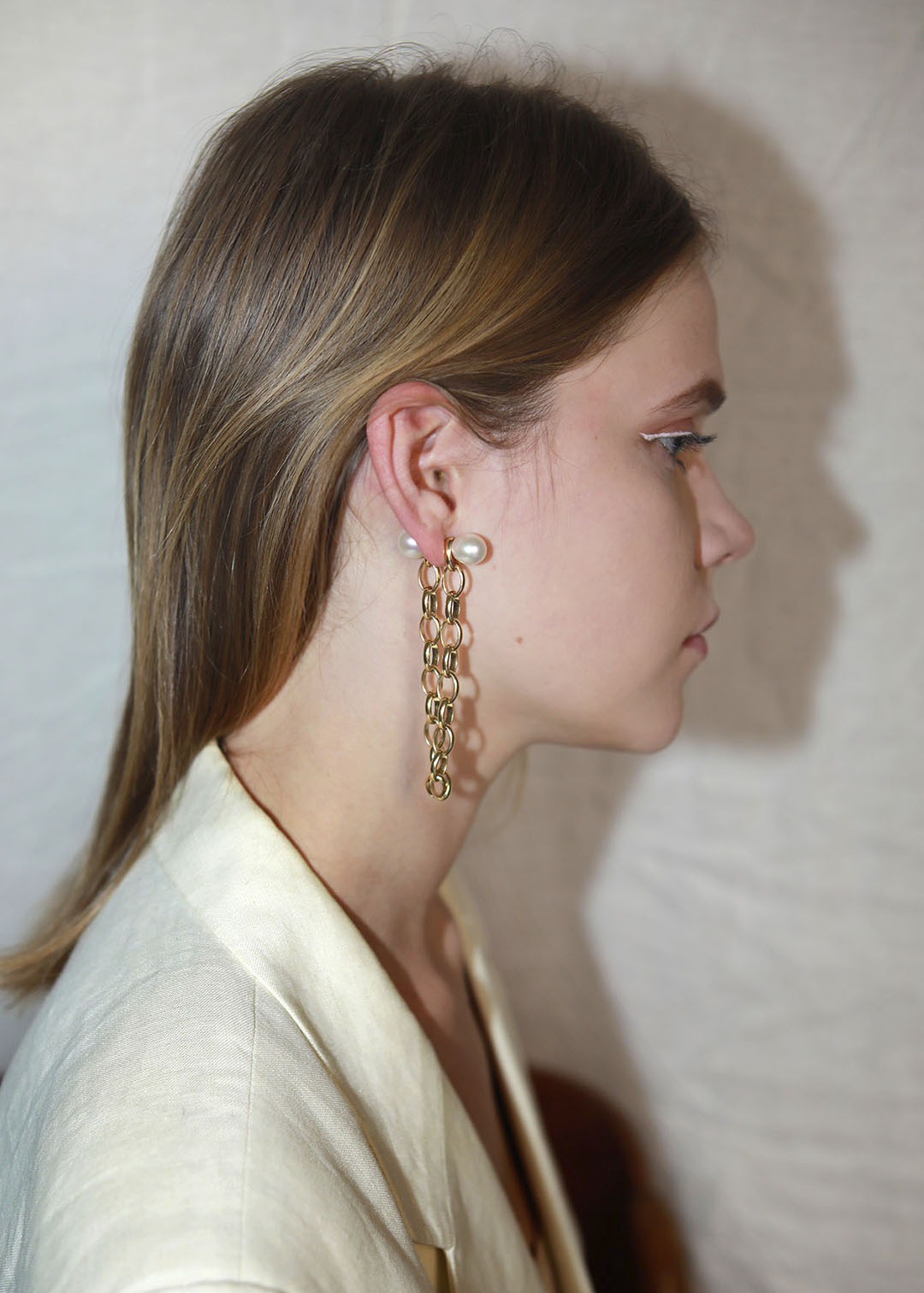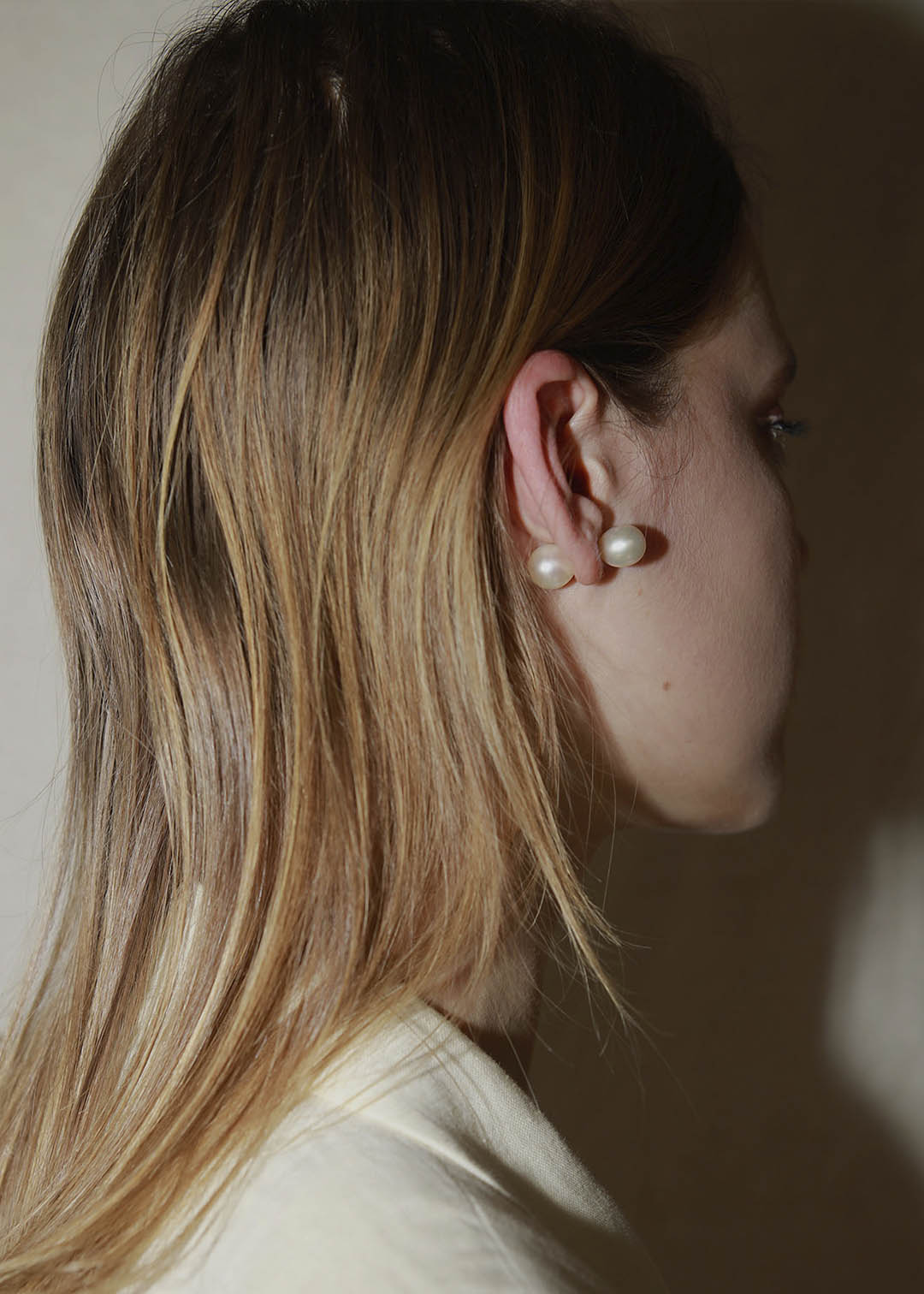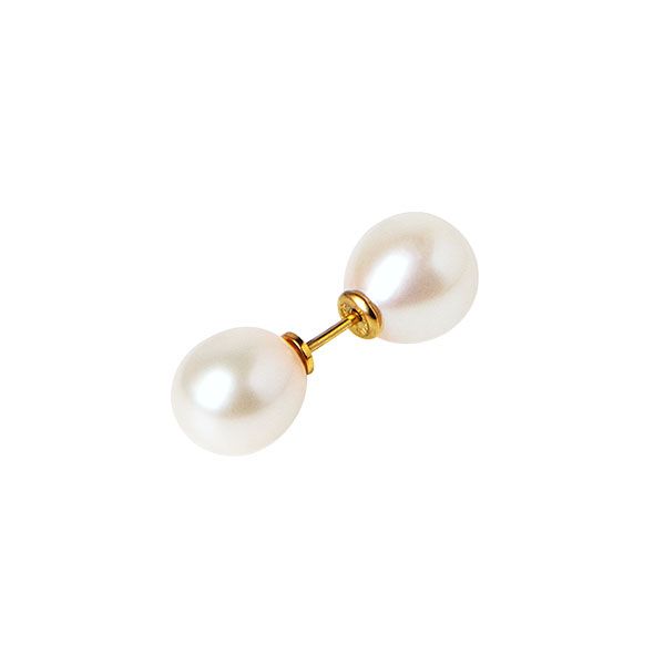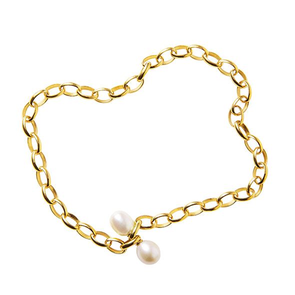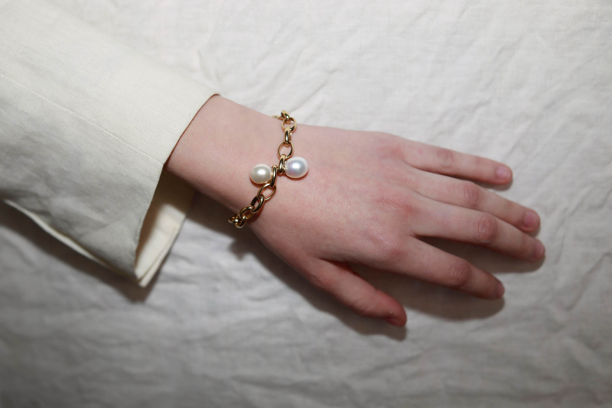 Gold plated sterling silver large oval chain bracelet pierced with a two oval fresh water pearls earring piece. The earring can be used separately with or without the chain. The front and back may be mixed and matched with other piercings from the SELF collection, creating infinite possible looks.