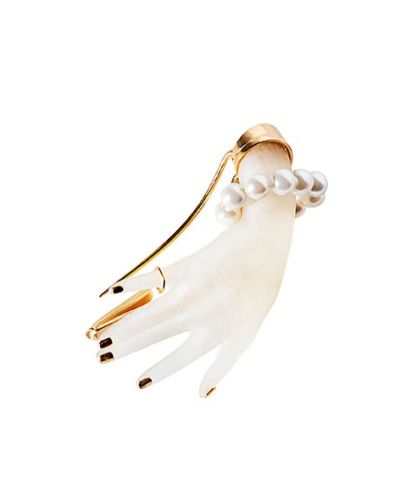 Gold plated silver and 3D printing biocomposite hand necklace with gold plated silver nails. The material of the hand is a BIO plastic coming from oyster shells giving the hand a pearled finish. This material is ecofriendly, biodegradable and sustainable.