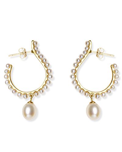 Gold plated siver pair of combs set with round fresh water pearls and a dangling baroque fresh water pearl.