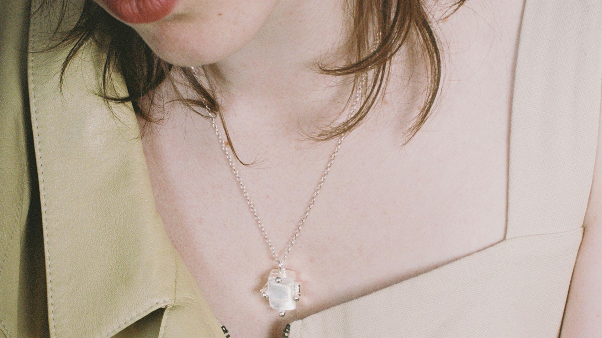 A sterling silver pendant shaped as a mini pillbox, topped with smooth, transparent quartz, hanging from a chain. Its clear surface invites a quiet interaction with whatever you choose to carry, transforming a small object into a subtle, personal statement.