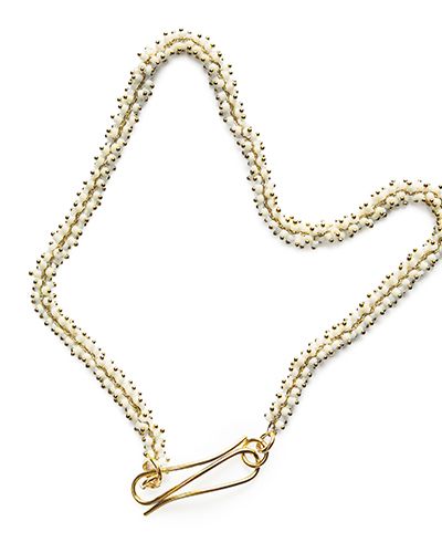 Gold-plated brass chain earrings dotted with white glass beads. Simple yet playful. The part in contact with the ear is crafted in gold-plated sterling silver.
