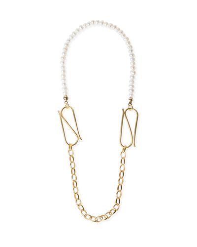 Gold plated sterling silver safety pin earrings with fresh water pearls.