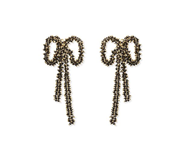 Silver-plated brass bow earrings dotted with yellow glass beads. The part in contact with the ear is crafted in sterling silver.
