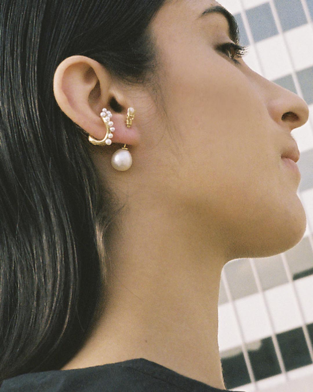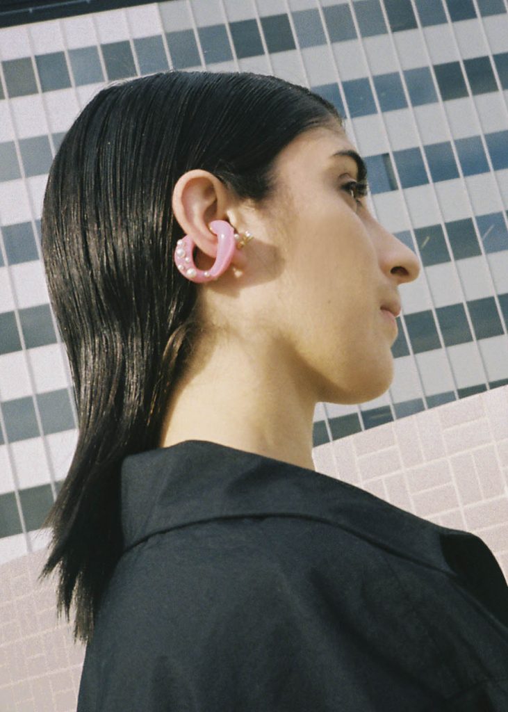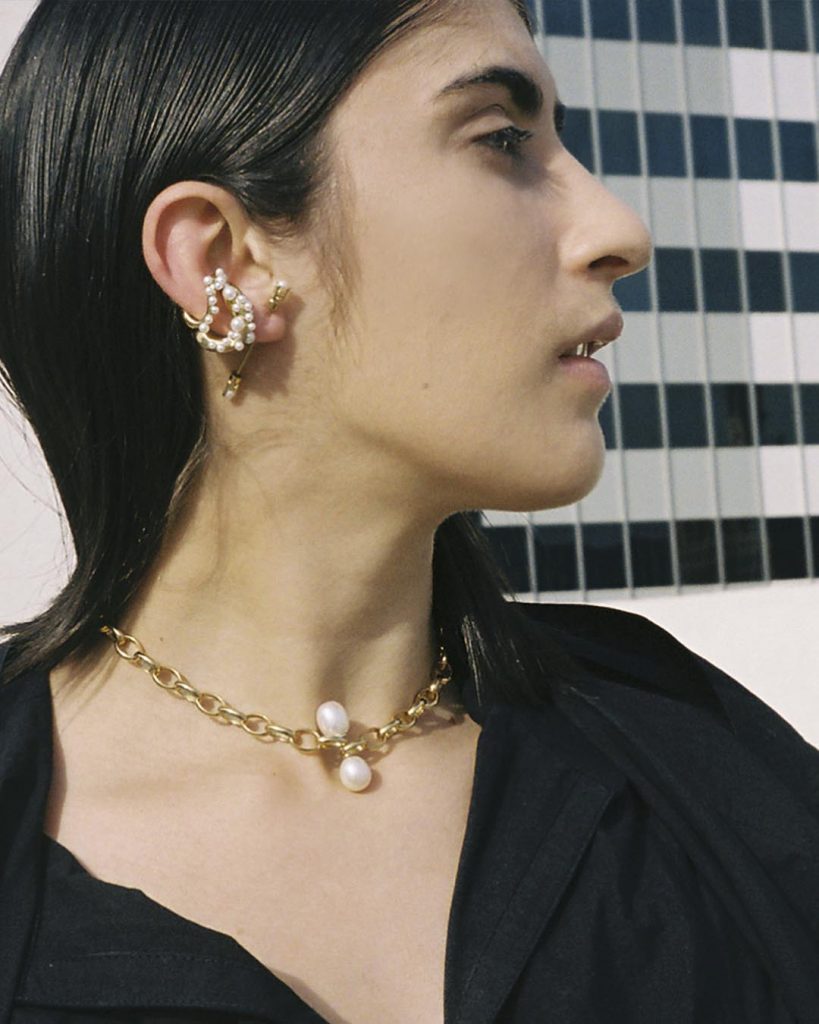 For Fall 2022, we offer a collection of convertible jewelry in which piercings may be worn as earrings, as clasps for necklaces and bracelets, or pierced into drilled-through rings. Each piercing consists of removable ends embellished with pearls or chalcedony which may be detached and reassembled, mixed and matched. Pieces can be combined and configured in various ways, offering freedom to create your own personal combinations. Create what you desire.
